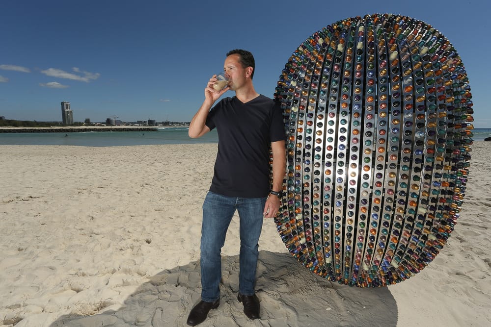 Appearing levitated above ground, the textured geometric superegg shape, as documented by mathematician Gabriel Lame, is dotted with random discarded coffee capsules arranged into perfect lines.