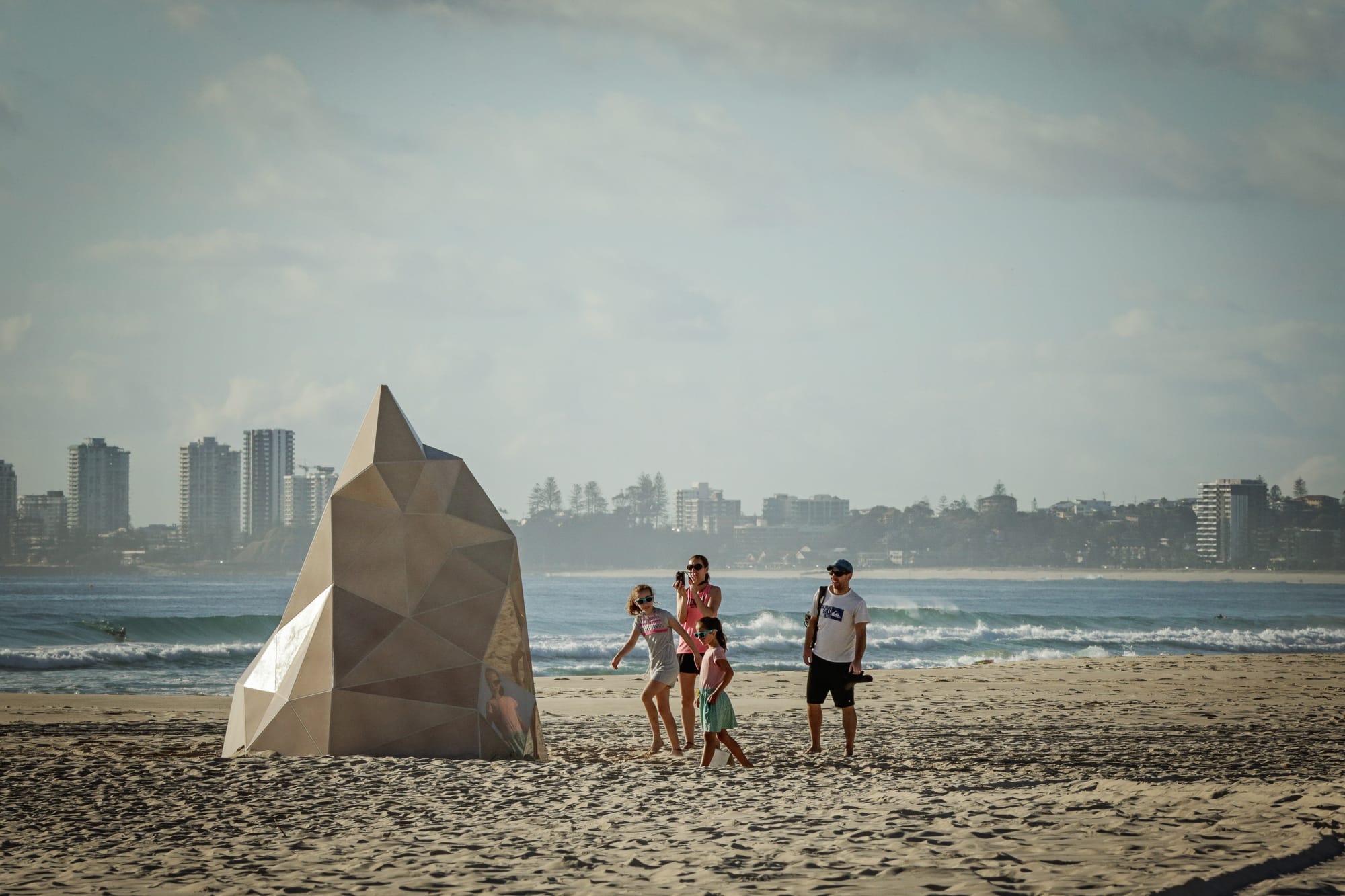 On the beach at Currumbin, the sculpture sat in the sand like something frozen mid-rise. Visitors could walk around it, touch the surface, compare the printed sand to the real sand at their feet.